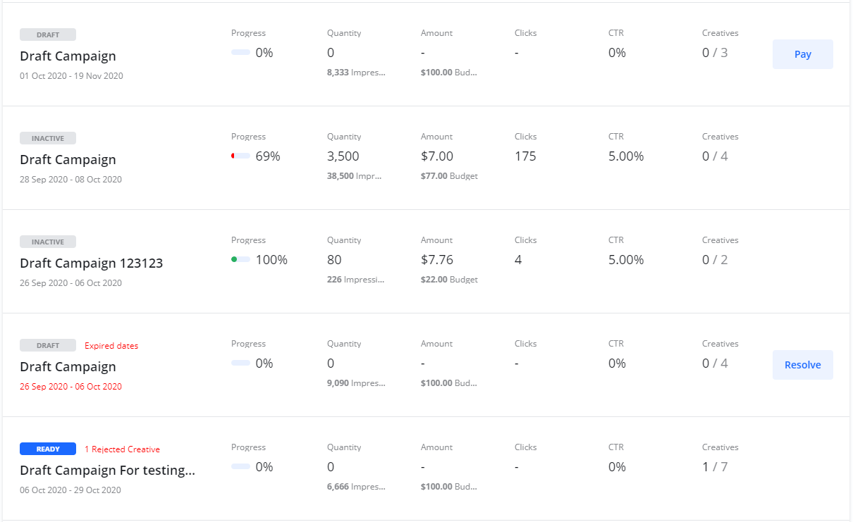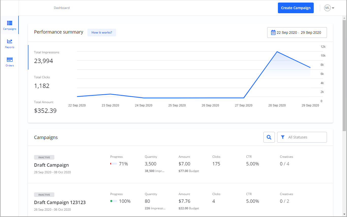 The Campaigns Dashboard is the first page after you login. On this page you see a summary of all your Campaign's statuses and performance.