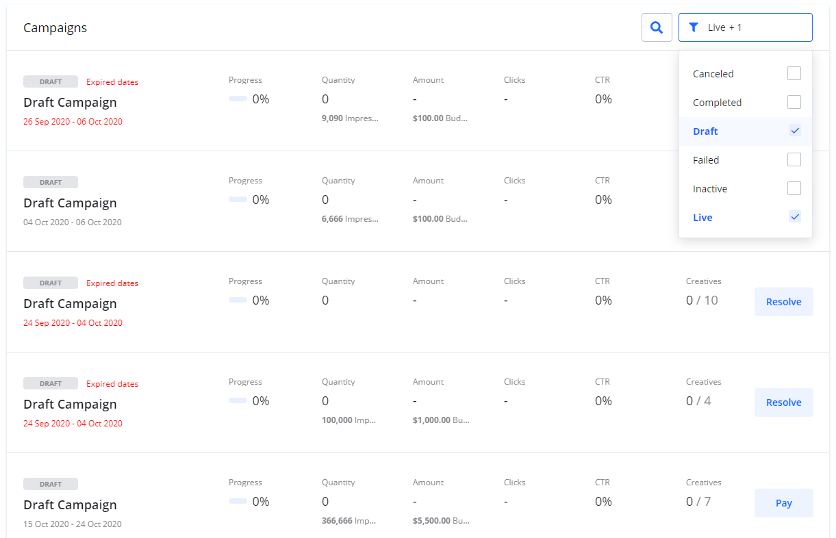 Confirmed Campaigns are waiting for at least one approved Creative or are waiting for start date.Live