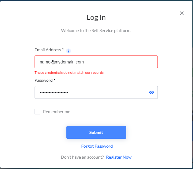 If your account and password does not match an account in the platform, you will be shown an error message. Please check your email address, the password and try again.