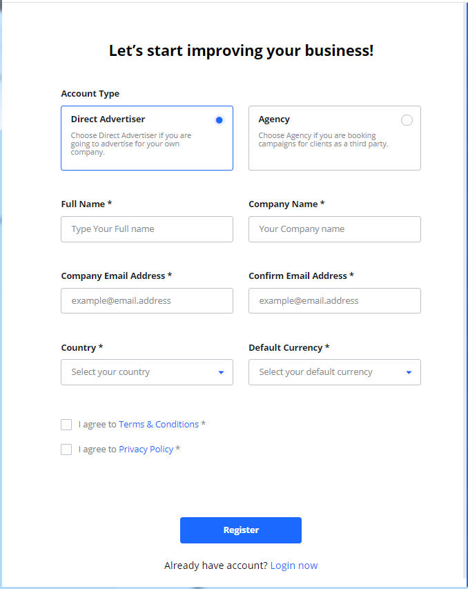 Select the account type that fits your business, Direct Advertiser or Agency.