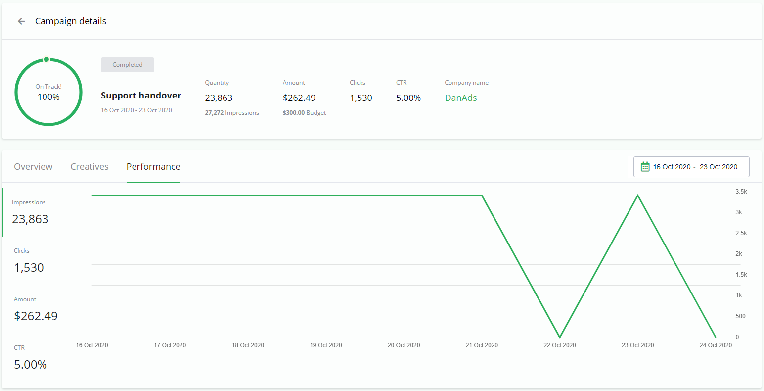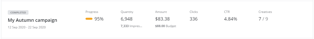 In the Campaign list you can see your original Budget, Amount delivered, Quantity, Impressions, Clicks and CTR (click-through-rate).