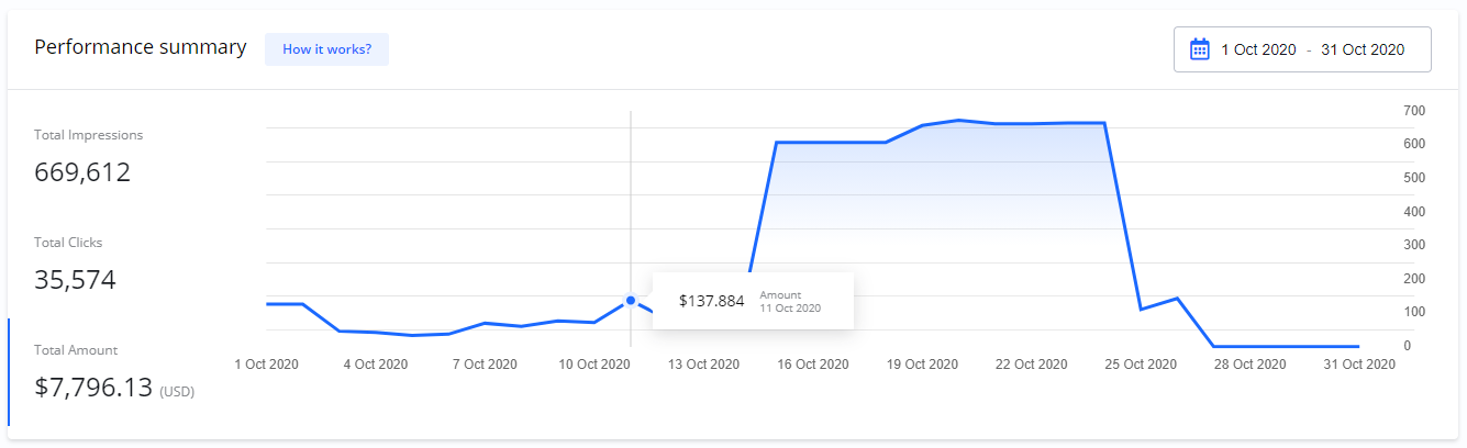 On your Dashboard > Performance summary you get an overview of total statistics for all your Campaigns.