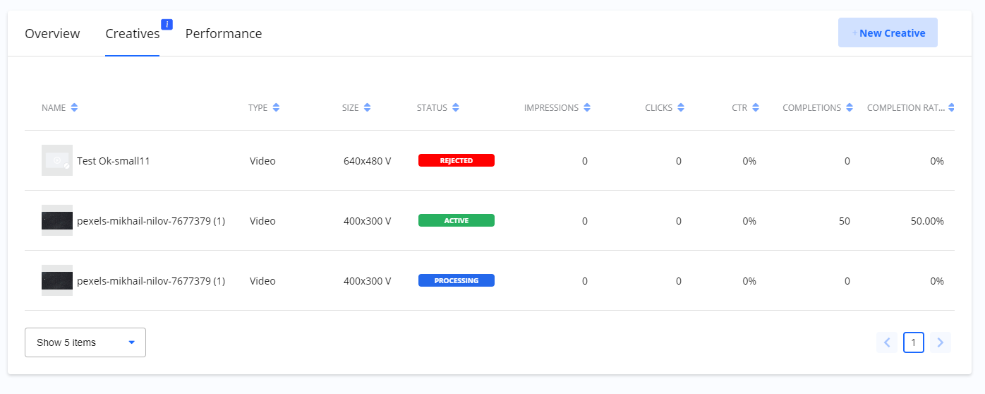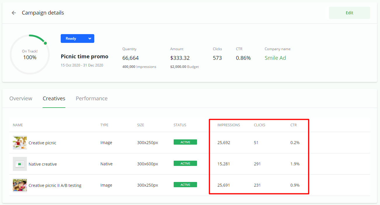 Campaign details > Creatives give you an overview of statistics per Creative.