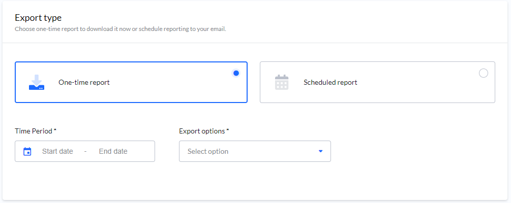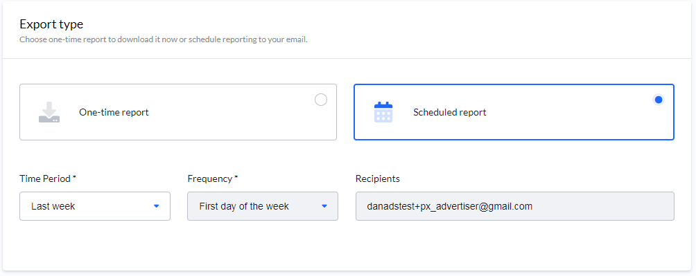 You decide if you want either a one-time report for download, or a scheduled report which is sent to your email address regularly.